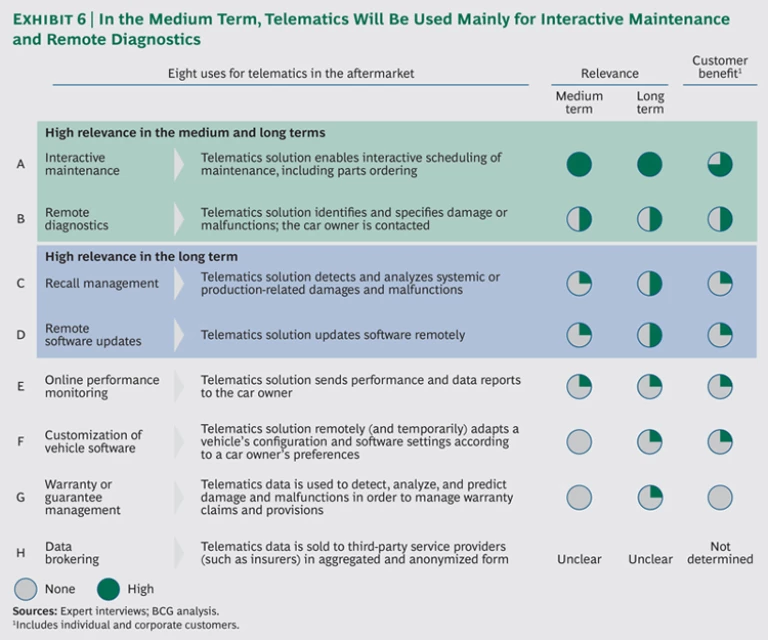 Likely Uses of Telematics in the Aftermarket. On the basis of responses to our survey, we see eight possible uses for telematics. (See Exhibit 6.)