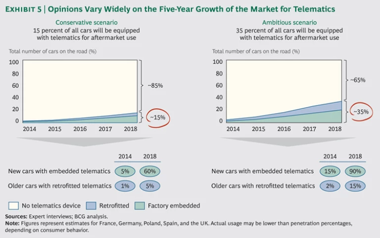 The anticipated increase in the percentage of new cars with embedded connectivity, combined with the expected growth in retrofitting, lead some executives to think that telematics penetration will likely climb to 15 percent of all cars on the road by 2018, while others expect the share to grow to 35 percent. (See Exhibit 5.) When asked about the new-car segment in particular, respondents said that by 2018, they expect 60 to 90 percent of new cars to have an embedded telematics solution that can support after-sales service.
