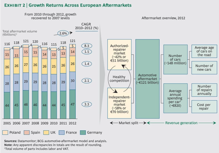 The size of the five national aftermarkets on which we focused grew from €115 billion in 2010 to approximately €121 billion in 2012, a compound annual growth rate (CAGR) of 2.6 percent. Four of the five markets had growth rates in the low single digits. Poland was the outlier, growing by about 8 percent per year. (See Exhibit 2.)