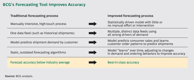 To illustrate the effectiveness of BCG’s forecasting and demand-planning approach, consider the example of a major consumer products company in North America. A household name with a well-established supply chain, the company suffered from too much inventory and a planning process that required substantial employee input and time to complete. It relied on generic forecasting tools that failed to account for the company’s specific products and markets. In some cases, employees didn’t fully understand how to properly deploy these tools.
