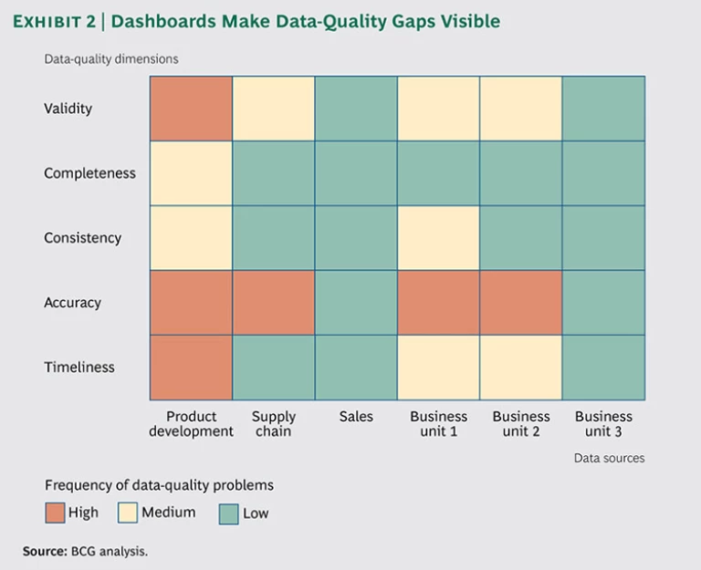 A gap analysis can reveal the difference between the baseline and target state for each data source and can inform an action plan to improve each data-quality dimension. Gaps can be made visible and tracked through a dashboard that color-codes performance for each of the major dimensions of data quality. (See Exhibit 2.)