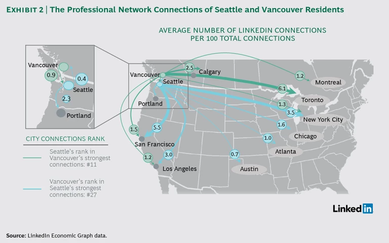 This research suggests that together, Seattle and Vancouver have the potential to boost their combined performance across all the innovation enablers. In areas of unilateral strength, a partnership may allow the leading city to promote the development of the other. And where both have room to improve, scale advantages could become a mutually beneficial enabler. For example, collaboration across the three leading research universities—the University of Washington, the University of British Columbia, and Simon Fraser University—could perhaps create a more thriving research environment. Connectedness. The low level of connectedness between the two cities, however, is a serious impediment. Today, few companies or public-sector entities collaborate across the border. According to data from LinkedIn, there is a similarly low level of connection between individuals in Seattle and Vancouver, and talent does not flow freely between the two cities. For example, Vancouver’s LinkedIn members’ connections to members in the Greater Seattle area account for less than 1% of their total connections; in fact, Vancouver’s members have more San Francisco connections than Seattle connections. Among Seattle members, the figure is even lower; only 0.4 percent of their total connections are with Vancouver individuals. Seattle is more connected to Atlanta than to its neighbor to the north. (See Exhibit 2.)