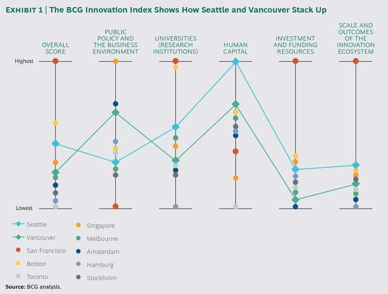 Impressively, Seattle and Vancouver ranked first and second, respectively, in human capital, thanks in large part to their high marks in livability and well-educated populations. Seattle scored higher than Vancouver in universities, investment and funding resources, and scale and outcomes of the innovation ecosystem; Vancouver ranked well above Seattle in public policy and the business environment, owing to the city’s favorable tax structure and more open immigration policy. (See Exhibit 1.)