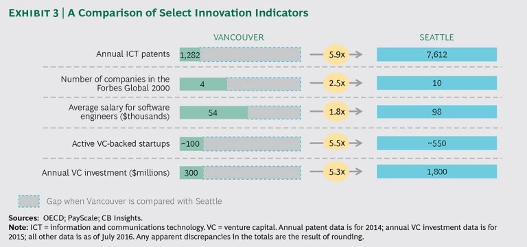 Overcoming the Challenges to Collaboration. Despite their many complementarities, Seattle and Vancouver face several challenges in establishing an innovation corridor. One hurdle is that the international border restricts the free flow of talent and hinders travel. Differences in scale are another: in measures of innovation inputs and outputs, Seattle is generally substantially larger than Vancouver. (See Exhibit 3.)