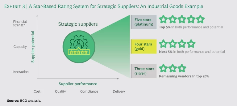 Once they’ve ranked every supplier, companies can easily identify their top-tier, or star-rated, suppliers. Large businesses with mature supplier management processes can further divide their most strategic suppliers into three groups. One industrial goods conglomerate, for example, designated the top 5% of suppliers in both performance and potential as the five-star, or platinum, group; the next 5% were named the four-star, or gold, group; and the subsequent 10% were termed the three-star, or silver, group. (See Exhibit 3.)