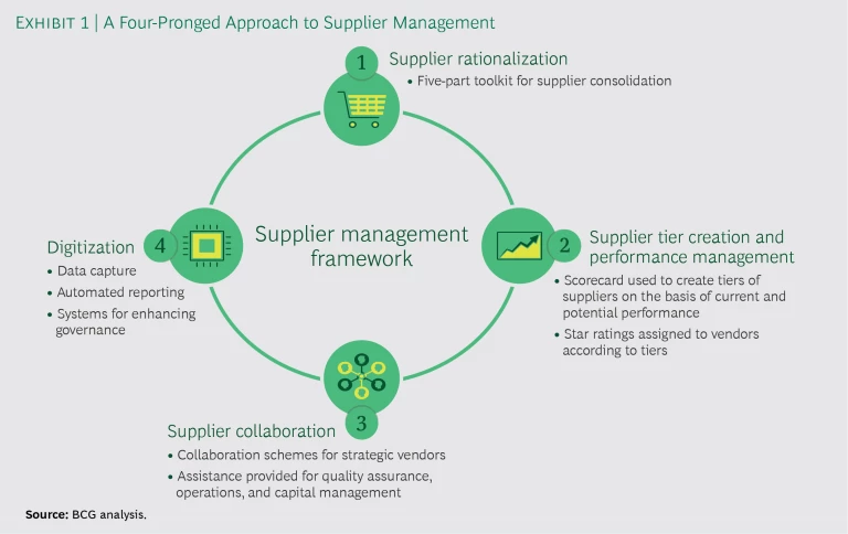 Businesses should then pursue a comprehensive approach to their supplier management process—rationalizing their supplier base, establishing robust supplier performance management with multiple tiers of suppliers, creating supplier collaboration programs, and digitizing the entire supplier management process. (See Exhibit 1.)