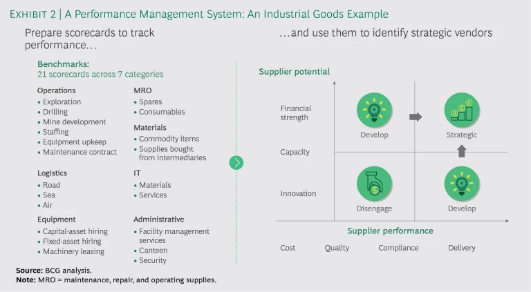 The Critical Elements. First, companies should designate core supplier categories. Our experience suggests seven key categories: raw materials; equipment; maintenance, repair, and operating supplies (MRO); operations services; administrative services; IT; and logistics.