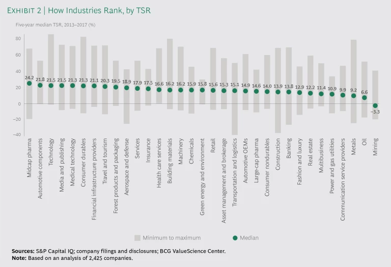 The lesson is this: being in a sector whose market performance is below average is no excuse. TSR is a relative—as well as an absolute—metric, so whether an industry is under pressure or accelerating, every company has the opportunity to outperform its peers. No matter how bad an industry’s average performance is relative to other sectors and to the market as a whole, it is still possible for companies in that industry to deliver superior shareholder returns. (See “How Top Value Creators Outpace the Market—for Decades,” BCG article, July 2017.)