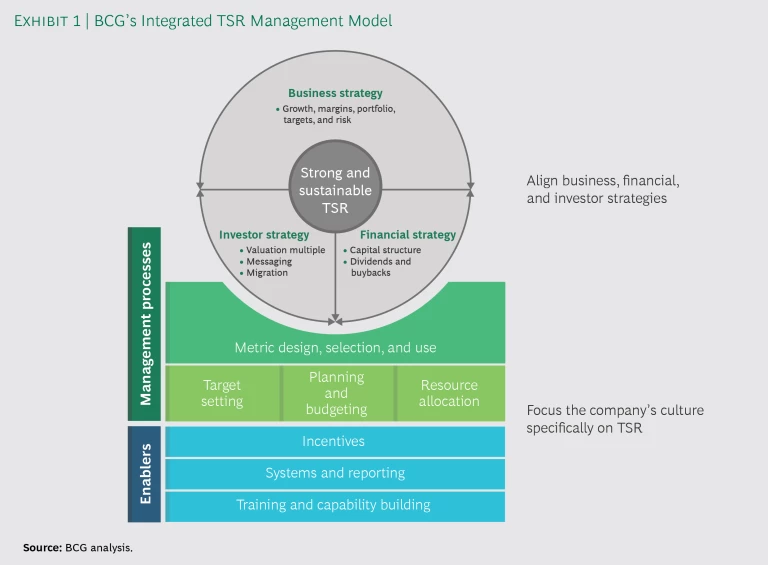 Substituting any proxy metric for TSR inevitably leads companies off course. When earnings per share (EPS) is the principle governing metric, for example, managers can end up “buying” increased EPS by cutting important investments such as R&D or making excessive capital expenditures, ill-advised M&A moves, or poorly timed buybacks. In contrast, TSR is balanced, and it takes into account all the critical factors that drive fundamental value: revenue growth (from reinvestment in the business), margin expansion (from cost control and pricing), and cash flows (which can be reinvested in more growth or used for debt reduction, dividends, and buybacks). TSR also takes into account how managerial actions that determine the valuation multiple, such as investing in the future, optimally deploying capital, or reducing risk exposures, affect investor expectations.