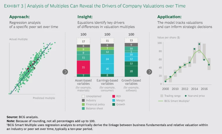 8. Valuation multiples are no longer a black box. In many cases, managers think that a company’s valuation multiple is a random and uncontrollable outcome and that fickle investors don’t truly understand the businesses in which they invest. We respectfully disagree. While multiples move somewhat randomly over short time periods as they incorporate a wide range of information about future profits and risk, they are not random and certainly not uncontrollable. We have invested more than 20 years in building an analytical tool set that helps companies understand how their shares trade in public markets and which financial KPIs investors take as signals of a healthy (or unhealthy) business outlook. Our tools reveal the key drivers of valuation, which, in turn, can reveal strategic information about a business. (See Exhibit 3.)