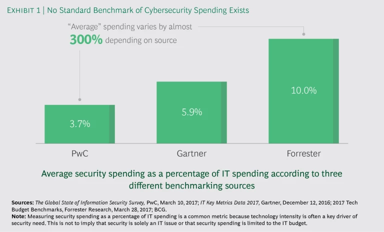 If you are thinking about solving your cybersecurity challenges by purchasing new technology products and services or increasing security staff, you are likely looking for guidance about how much spending to allocate. But it’s hard to compare an individual company’s spending against any benchmarks. Some of the leading voices in the industry prescribe very different approaches to calculating spending on cybersecurity. (See Exhibit 1.) These differences reflect some fundamental truths, misperceptions, and unknowns about cybersecurity at this stage of the game.