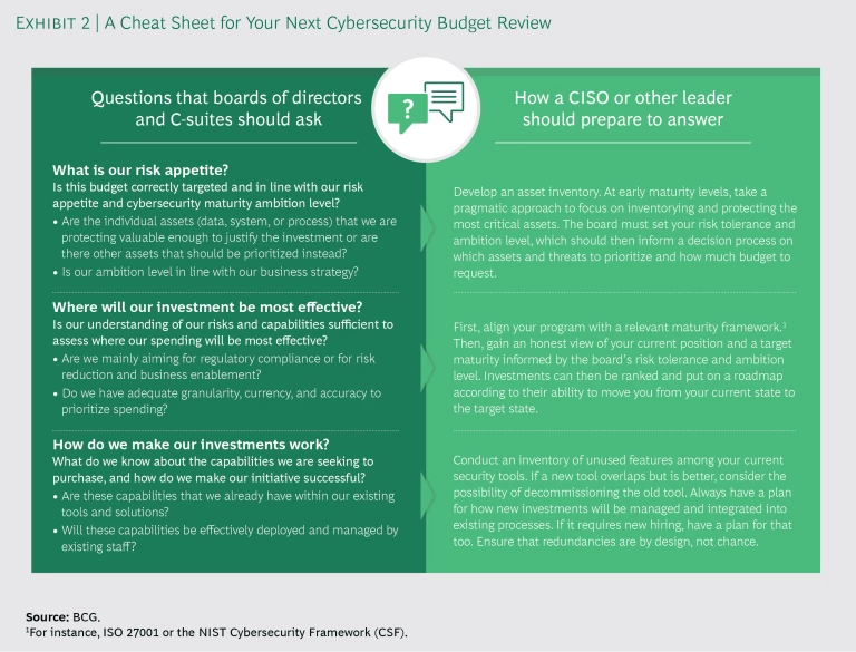 Whatever your role—CISO or member of the board or C-suite—you need to be prepared to answer the question. Once you have asked and answered the truly necessary questions (summarized in Exhibit 2), you can develop a risk-based security strategy that you can stand by. You will be prepared to justify, with robust maturity and risk assessments, your spending decisions, whether they involve decreasing or increasing security spending or maintaining a level less or more than the median among your peers.