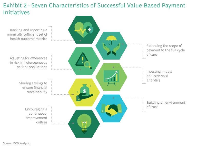 Of the 30 value-based payment initiatives we studied, about half reported quantified improvements in both quality and costs, a quarter reported improvements but without rigorous assessment, and another quarter reported mixed results or no improvement in health care value. When we looked closely at these case studies, we identified seven characteristics that were common to successful value-based payment initiatives—regardless of the payment model—and that distinguished them from the rest. (See Exhibit 2.)