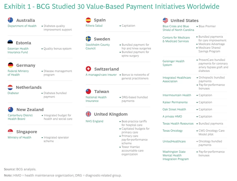 That system-wide level is the focus of this report. During the past year, BCG studied 30 value-based payment initiatives worldwide and reviewed the growing scientific literature about payment models. We looked at programs initiated by public and private payers covering single provider organizations and multiple organizations, and by governments that are leaders in value-based health care as well as others that are just beginning to focus on value. (For a list of initiatives studied, see Exhibit 1.)