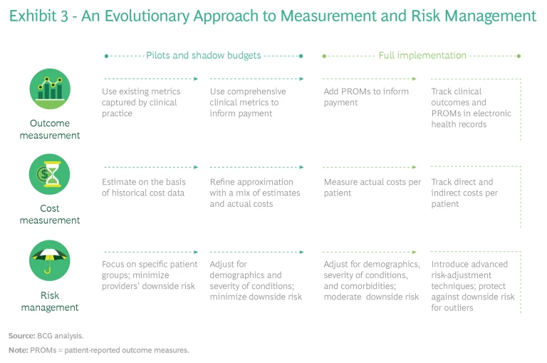 For example, to measure health outcomes, start by using existing metrics that are already captured in clinical practice; then, over time, develop advanced information systems in order to routinely capture metrics for both clinical and patient-reported outcomes that are in patients’ electronic health records. To track costs, start with estimates that are based on historical data; then, over time, develop systems that track actual direct and indirect costs per patient. In parallel, start piloting the data and analytics platforms that are necessary to collect the data and share it across the system. To manage risk, initially focus value-based payment models on clearly defined patient groups and exclude downside risk to minimize providers’ financial exposure. Then, over time, gradually introduce more advanced risk-adjustment techniques that allow value-based payment models to be expanded to more complex patient groups (for instance, those with multiple morbidities). And as providers develop the capabilities to manage costs, exclude downside risk only for extreme outlier cases. (See Exhibit 3.)