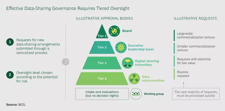 An effective structure has multiple tiers of oversight. (See the exhibit.) Approval by the board or senior management (or both) should be required for rare, high-risk requests, such as large commercial arrangements with significant potential to bring public scrutiny (likely fewer than a handful per year). The vast majority of requests, with lower levels of risk, should be adjudicated by designated data-sharing governance bodies guided by clear policies that ensure appropriate speed.