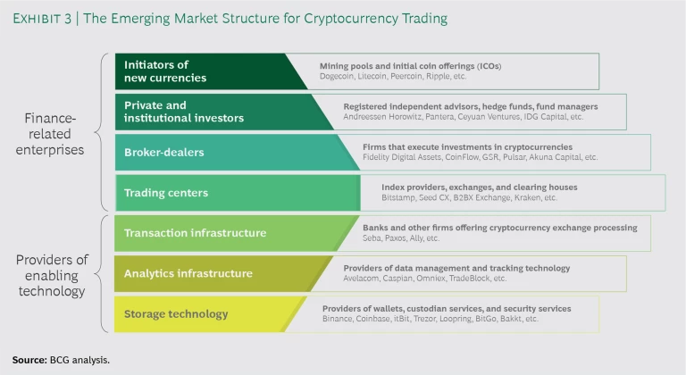 Finally, because the gains and losses in this asset class do not always correlate with the stock market, crypto investment is sometimes seen as a diversification play. A more established market structure for institutional trading in cryptocurrency is thus beginning to take shape. (See Exhibit 3.) Other than some investors, most of the companies involved in cryptocurrency tend to be young: less than two or three years old. But many will participate in the digital ecosystems, just emerging now, that will most likely facilitate cryptocurrency-related activity in the future.