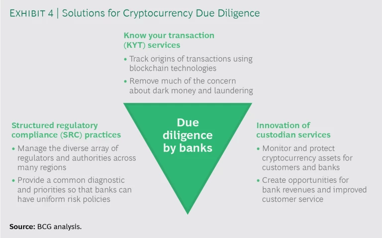 In practicing due diligence of this sort, banks can rely on three types of solutions: know your transaction (KYT), structured regulatory compliance (SRC), and custodian services. (See Exhibit 4.) These can be outsourced, but banks may benefit from bringing them in-house and making them substantial parts of the institution’s own crypto service chain. Together, these three solutions can build trust and address most concerns. They do not always need to be handled separately by each bank. Ultimately, the financial services industry will probably establish practices and platforms that embed these safeguards into every credible cryptocurrency offering.