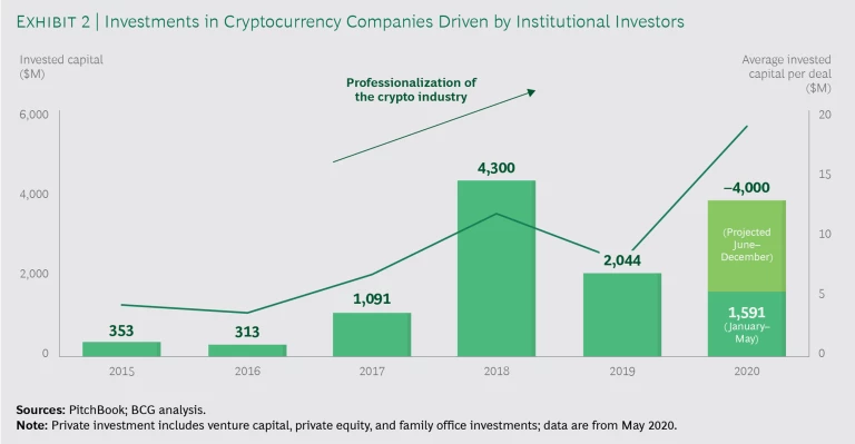 The continuing momentum in cryptocurrency is clear from the pace of investments by institutional investors, venture capital firms, and private equity funds. Invested capital per deal has risen from about $5 million in 2015 to almost $20 million during the first two quarters of 2020, much greater than investments per deal in the first half of the previous year. This year’s total invested capital looks like it will be close to that of 2018, which was a peak year. (See Exhibit 2.)