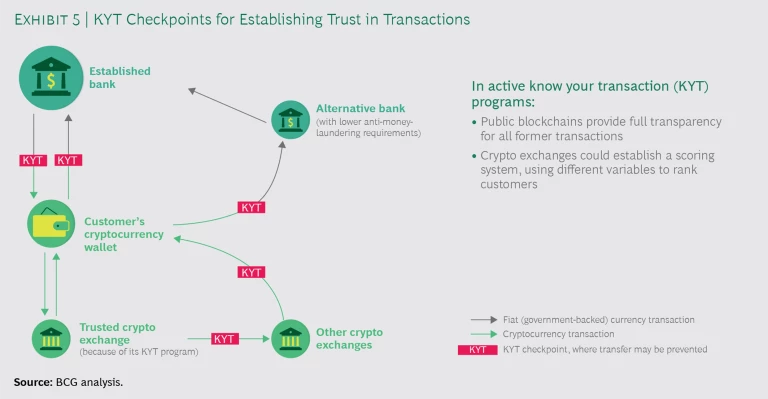 KYT does not replace KYC; they complement one another. Exchanges and banks can use them together in order to establish a scoring system, ranking potential customers according to (for example) the reputation of transaction partners or the timing as well as the geographic location of particular transactions. In this way, KYT could enable banks to meet their anti-money-laundering and financial-crime compliance obligations while increasing customer trust. Strong KYT programs might also make banks more willing to process transactions that would otherwise be prohibited by their internal policies. That would encourage customers to keep their business with the bank, rather than taking it to competitors.