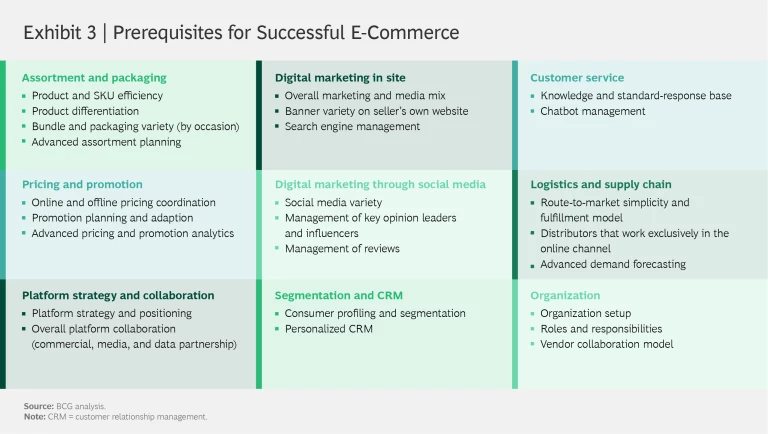 Companies should use this opportunity to develop their e-commerce 2.0 business strategies. Many leading companies are already planning to grow their e-commerce businesses, including for products such as building materials and tires, which retailers used to sell to in-store customers directly. Product assortment and packaging, digital marketing, merchandising, and customer service are among the areas in which companies must develop capabilities to succeed in e-commerce in emerging markets. (See Exhibit 3.)