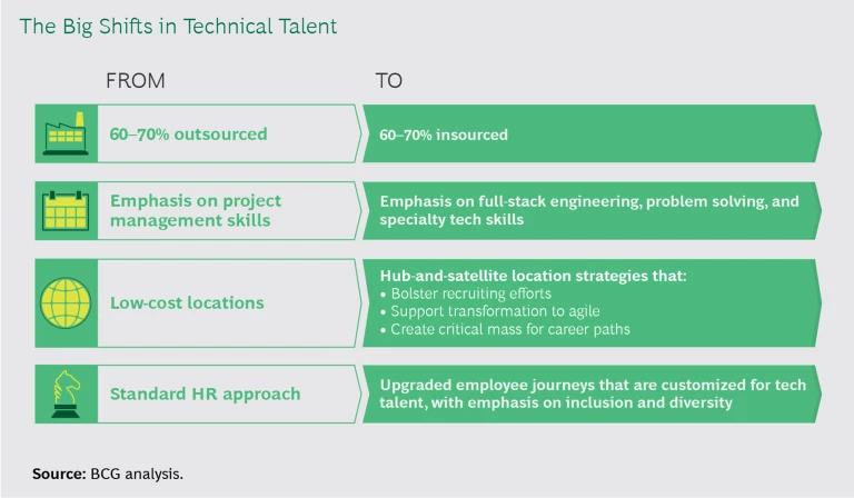 That era of back-office, outsourced IT has run its course. Companies today need a people strategy for their tech functions that reflects tech’s front-and-center position in product design, customer engagement, and redesigning business processes. Since tech talent is competitive, scarce, and tough to attract, companies that get it right first can establish an enduring advantage. Those that stick to the old ways of doing things will find catching up difficult.