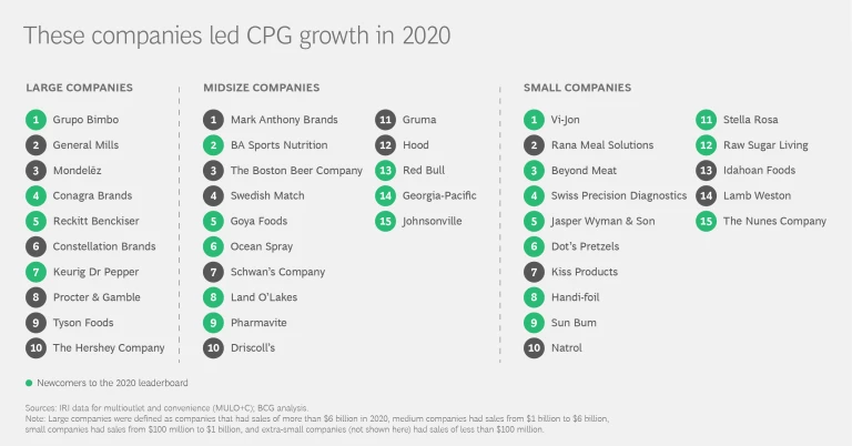 Grupo Bimbo topped this year’s list of large growth leaders, followed by General Mills, Mondelēz, and Conagra Brands. The most attractive categories were ready-to-consume foods (including bakery goods, frozen meals, and candy), cleaning materials, paper products, and home-care items.