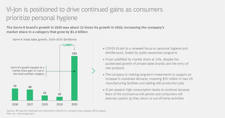 Vi-Jon is 2020’s fastest-growing small company—it experienced more than 450% year-over-year sales growth—thanks largely to its Germ-X hand sanitizer. Meanwhile, 6 of the top 15 small CPG companies more than doubled their revenues, fueled by pandemic-driven demand for easy-to-prepare and frozen foods, health products, and at-home cosmetics.