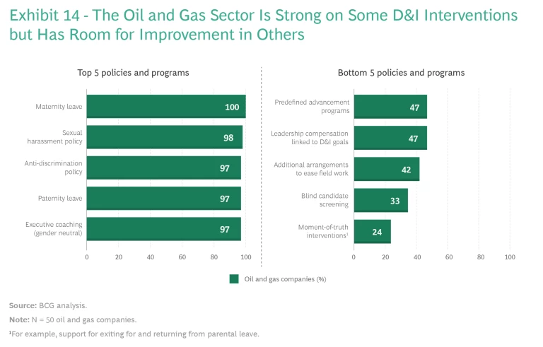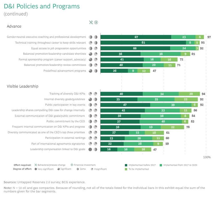 Oil and gas companies can take several steps to promote D&I in advancement policies and processes. To minimize unconscious bias, they can adopt “blind” recruitment processes (which remove the candidate’s name and any other identifying factors from applications), have multiple diverse candidates on each slate, actively shape “stretch” roles for diverse candidates to support development pathways, and use more diverse interview panels. Mandatory training can help managers realize the potential operational and financial benefits of greater diversity as a source of competitive advantage. And openly recommitting to diversity and reframing outreach programs to make them more gender-neutral and inclusive of diverse backgrounds can increase companies’ attractiveness to potential hires.