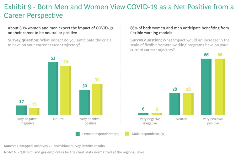 However, women who remain in the oil and gas sector seem to feel the impact of COVID-19 on their career only slightly more negatively than male colleagues do. (See Exhibit 9.) Both men and women see flexible work models as a positive development over the past two years. In our employee survey, about 65% of male and female respondents said that they expect to benefit from the new models that have been introduced or expanded as a result of the pandemic.