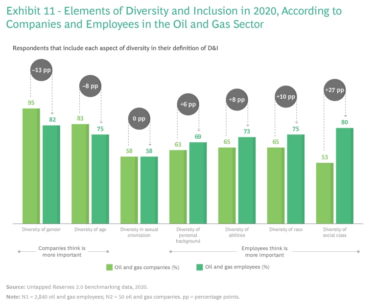 The oil and gas industry needs to take action on all fronts to embrace diversity in its broadest sense, foster greater inclusion, and build equity. Today, we see a disconnect between companies and their employees about what constitutes diversity and inclusion. Many employees expect a broader dialogue than companies currently provide, particularly on race, abilities, and socioeconomic diversity. (See Exhibit 11.)