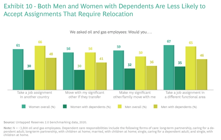 Our employee survey indicates that caring for a dependent person affects women’s job choices more than men’s, but such responsibilities have a noticeable impact regardless of gender: 30% of women with dependents and 48% of men with dependents would be willing to take on an international assignment, versus 61% and 66% respectively for individuals without dependents. (See Exhibit 10.) The best approach for companies to take is to avoid making assumptions about personal circumstances, and instead to ask and offer opportunities equitably. Although both men and women with dependents may decide to decline assignments that entail relocation, a substantial number of those with dependents (30% of female respondents and 48% of male respondents in our survey) indicated that they would say yes. The bottom line is not to assume what the answer will be, but instead to ask each individual directly.