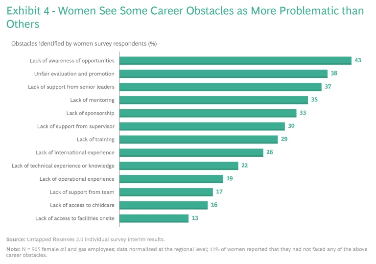 - Sponsorship and mentorship career obstacles are unique to women. Some obstacles to career advancement, such as unfair evaluations and an absence of international experience, were problematic for both men and women. Others, however, including a lack of mentoring and sponsorship and a lack of supervisor support, posed particular problems for women. (See Exhibit 4.)