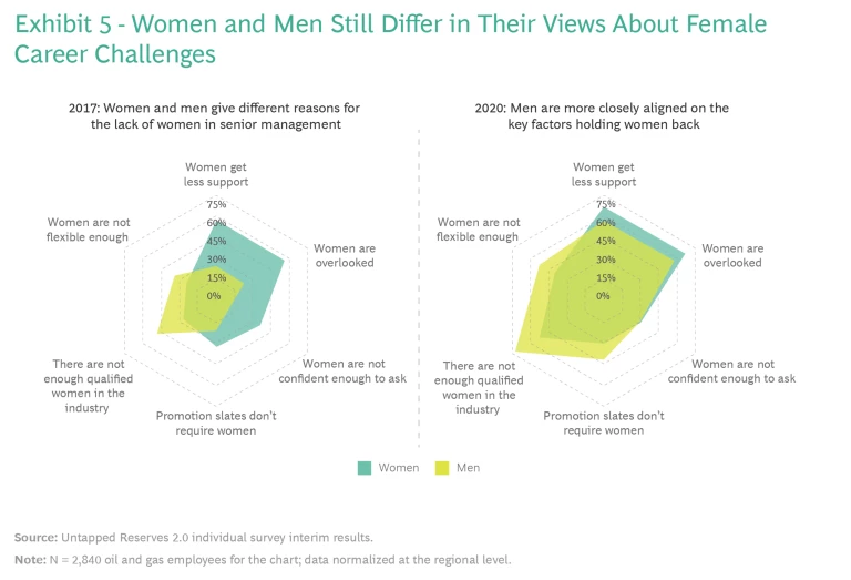 - Persistent Unconscious Biases Around Gender-Related Challenges. Although they are more aligned now than they were in 2017, women and men still differ in their views about female career challenges, with a significant perception gap remaining in several areas. Men hold over four-fifths of decision-making senior and executive-level positions, increasing the risk that a lack of understanding of the actual barriers faced may negatively impact women’s prospects for advancement.