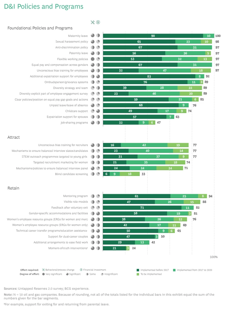 - Foundational D&I Policies and Programs. Companies need to ensure that strong policies and programs are in place so that they can track progress and maximize business performance. For example, they must introduce procedures to ensure that managers are held accountable for achieving D&I goals and to embed D&I values in decision making, in addition to providing basic (and often regulatory) requirements such as maternity/paternity leave, equal pay, and anti-discrimination policies.