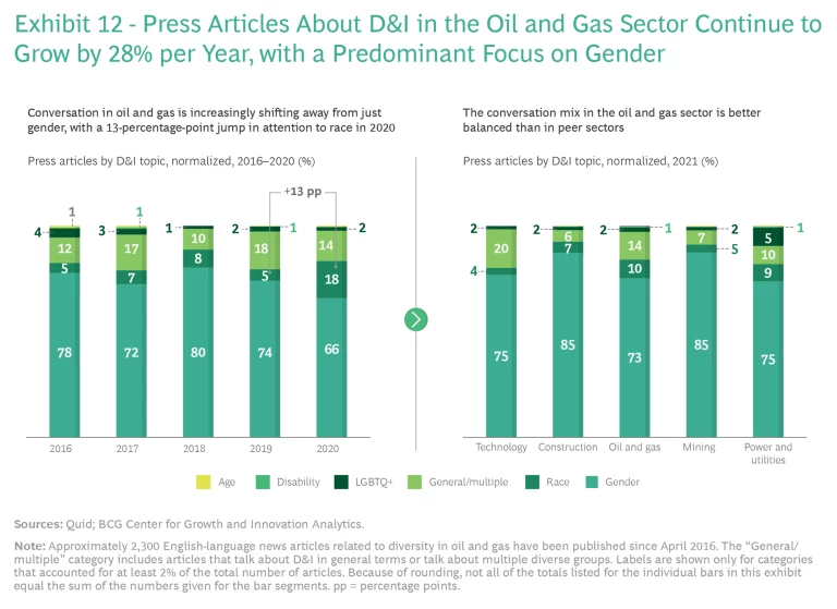 While other sectors have realized the importance of purpose-led work, better work-life balance, and equity, many oil and gas companies have only recently begun to commit to this journey in earnest. Our research shows that although the importance of race is increasing in the oil and gas sector’s D&I conversation (based on industry press coverage), gender remains the primary topic.