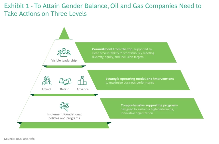 Three major developments impacted oil and gas companies in recent years and created major shifts in the way the industry functions: the energy transition, post-COVID-19 flexible working policies, and an expanding definition of diversity that extends beyond women to create a more inclusive environment for all types of people. Progress on all three fronts is critical if companies are to attract and retain talent, especially as more people make career choices based on their values. Another BCG study found that 57% of respondents to a global survey—and 90% of respondents from underrepresented (diverse) groups—would consider leaving their current job for one at a more inclusive organization if their company didn’t meet baseline D&I criteria. The research estimated the cost of replacing those employees at more than $25 billion a
