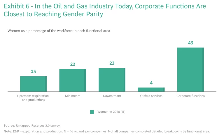 - The proportion of women working in business and administration (such as sales, business development, and finance) falls by more than 50% from entry-level roles to senior-level roles. This is consistent with our findings in 2017. The reason for the decline may be that skills developed in these areas are more readily transferable to jobs outside the oil and gas industry. Consequently, if their existing employer’s culture or level of inclusion is not positive for them, these employees can move to another company, or even another sector, that may be more inclusive. At the same time, because corporate functions consist largely of business and administration roles—an area where women are still better represented—it comes closer to achieving gender parity than any other functional area in the industry, particularly for early career steps. (See Exhibit 6.)