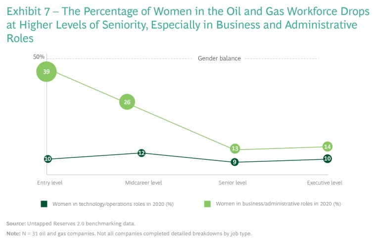 - The proportion of women in technical and operations roles—equipment handling, maintenance, and other field service disciplines—remained relatively stable across career steps, most likely because the relevant qualifications, skills, and experience are less transferable outside of the oil and gas industry. Women’s representation within this group remains very low, as women account for less than one in eight technical and operations employees at all career levels. (See Exhibit 7.)