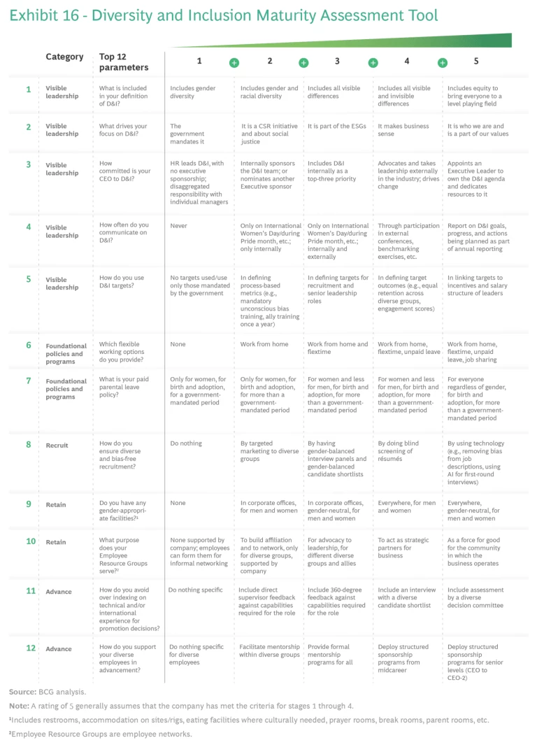 The Diversity and Inclusion Maturity Assessment tool consists of a checklist of 12 parameters across five categories, ranging from leadership to career advancement. Each parameter is defined along a five-step scale, where step 1 represents the bare minimum/table stakes action and step 5 represents the current view of a progressive, forward-leaning action (noting that this space and what is considered progressive will continue to evolve). The steps are typically sequential and additive, and they reflect increasing maturity of D&I approaches when read from left to right. Using this tool, companies can create a baseline for themselves today and identify blind spots and areas for further focused efforts and priorities.
