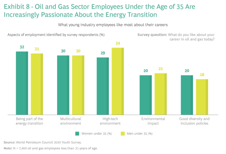Companies that actively and visibly take action to create clean energy businesses can attract a more diverse talent pool. According to the World Petroleum Council 2020 Youth Survey, about one-third of respondents viewed the energy transition as one of the things they like most about their careers. (See Exhibit 8.) Emphasizing a company’s efforts to advance the energy transition will increasingly become a prerequisite for success in recruiting diverse talent.