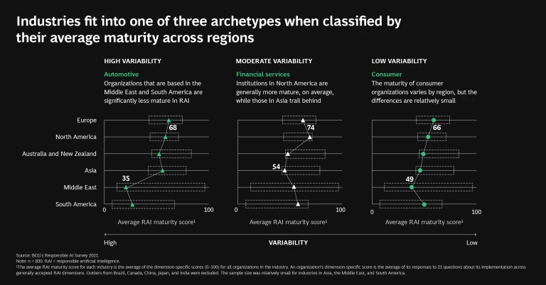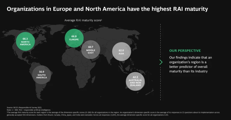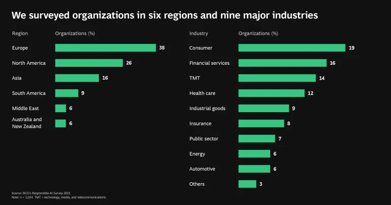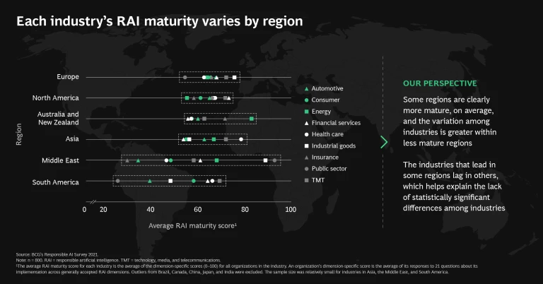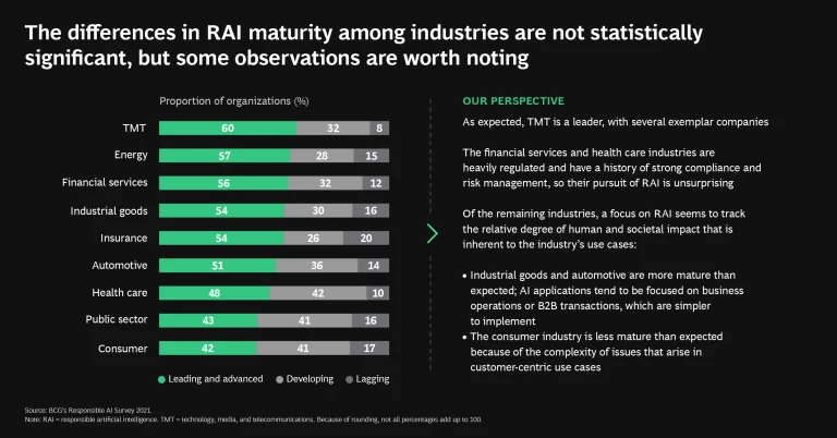 When looking across industries and regions, in turn, we found that an organization’s region is a better predictor of its maturity than its industry: Europe and North America, respectively, have the highest average RAI maturity. In contrast, we found few significant differences in maturity across industries, although a higher concentration of RAI leaders can be found in the technology, media, and telecommunications industry and in industrial goods.