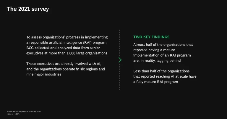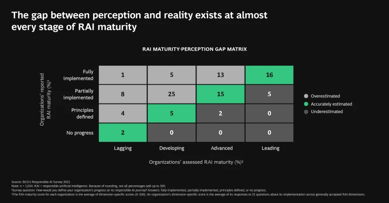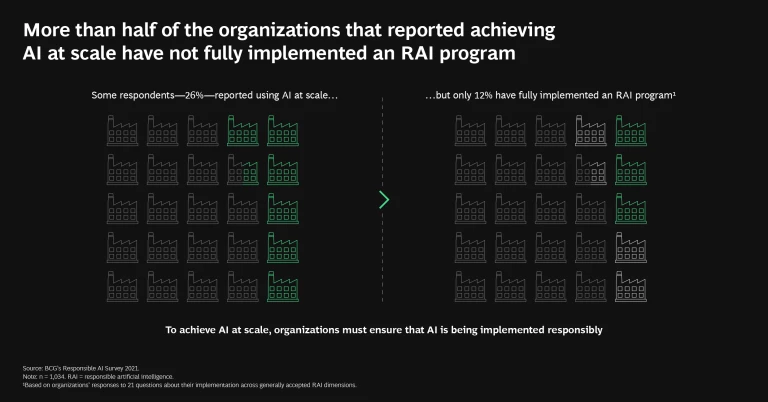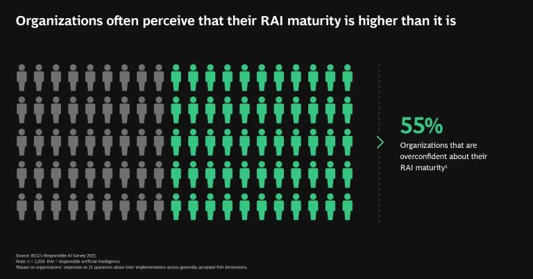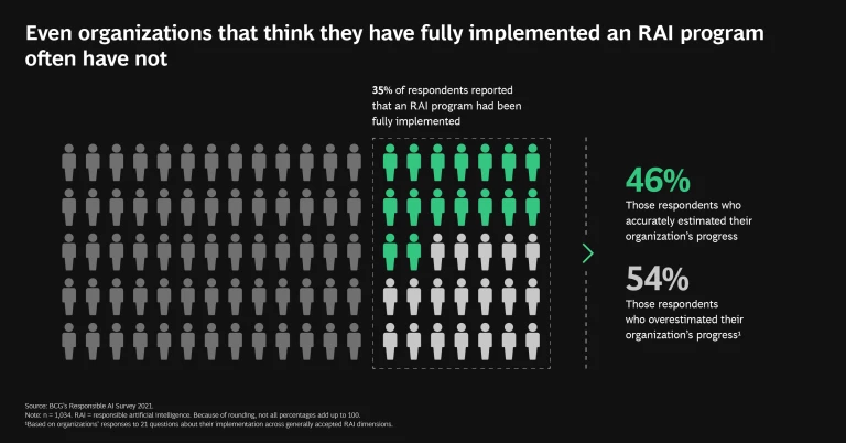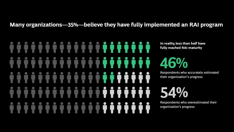 A new BCG survey of large organizations found that almost half of those that believe they have a mature implementation of a responsible artificial intelligence (RAI) program are, in reality, lagging behind. Even organizations that reported rolling out AI at scale overestimated their RAI progress: less than half have a fully mature RAI program. This finding is particularly important because an organization cannot achieve true AI at scale without ensuring that it is developing AI systems responsibly.