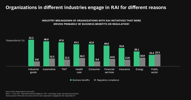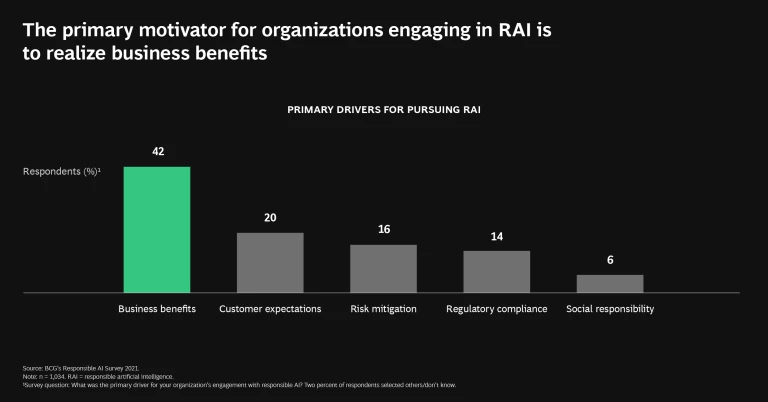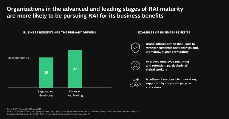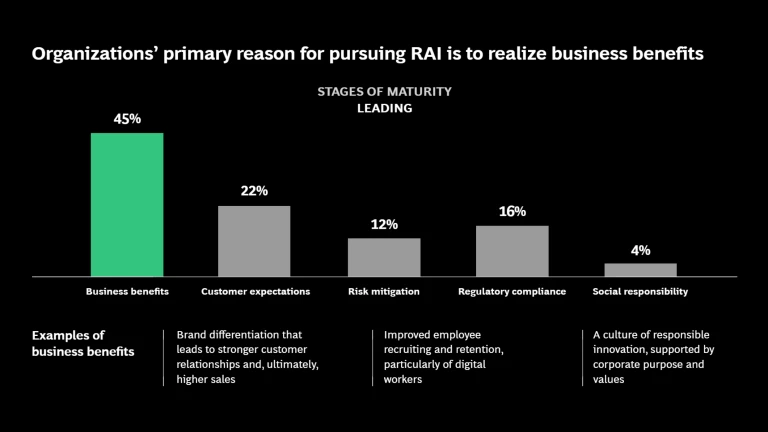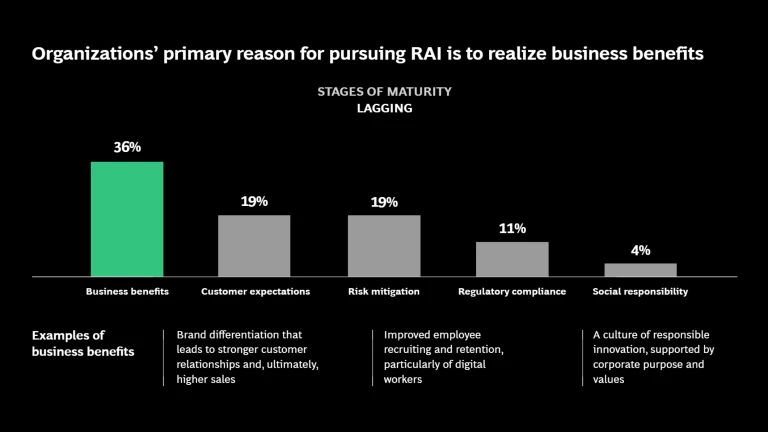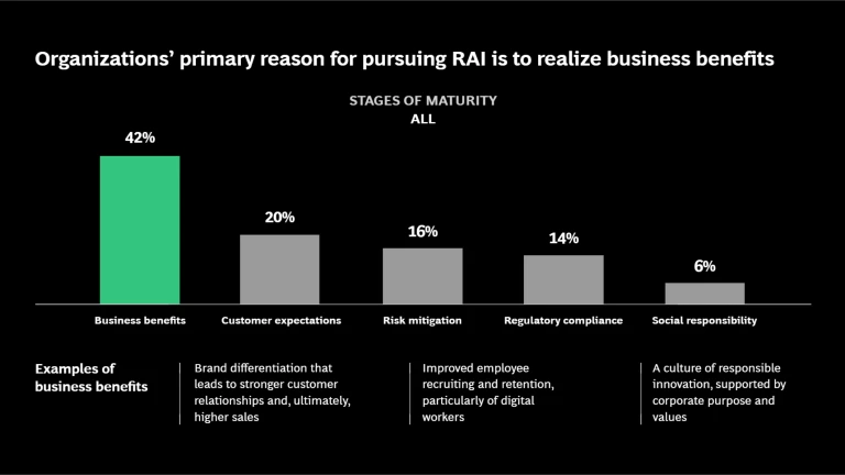 It seems that most organizations agree. When asked to select the primary reason for pursuing RAI, more than 40% chose its potential business benefits—more than twice the percentage that selected risk mitigation. Moreover, we found that as organizations’ RAI maturity grows, so does their motivation to capture business benefits through RAI. Simultaneously, the focus on risk mitigation decreases.
