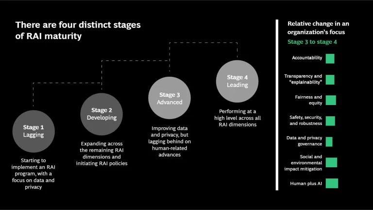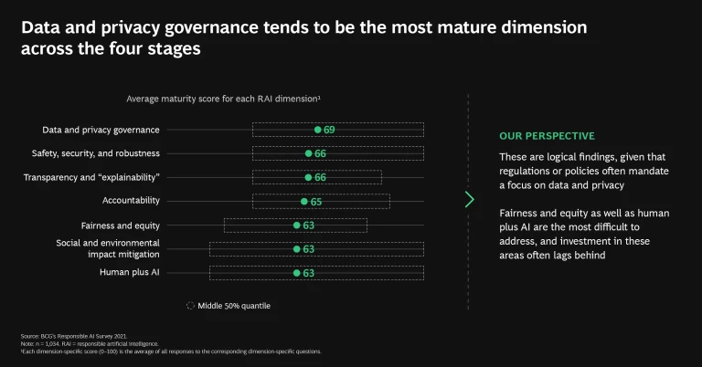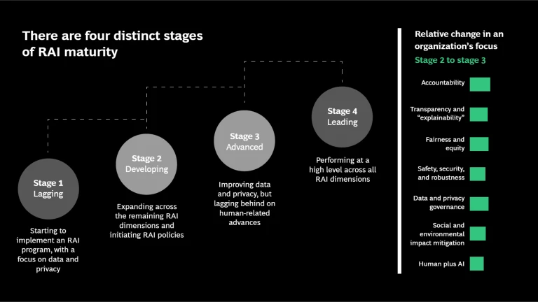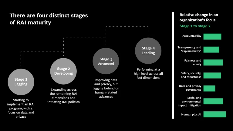 As organizations progress from lagging to leading, each stage is marked by substantial accomplishments, particularly in the areas of fairness and equity as well as human plus AI. This finding is important because organizations’ RAI programs don’t tend to initially focus on these dimensions, and they are the most difficult to address. Accomplishments in these areas are therefore highly indicative of broader maturation in RAI, and they signal that an organization is ready to transition to the next stage of maturity. Meanwhile, organizations consistently focus first on the area of data and privacy governance. This is a logical result, given that regulations and policies often mandate this focus.
