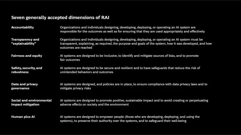 - Both the individuals responsible for AI systems and the business processes that use these systems adhere to their organization’s principles of RAI.
