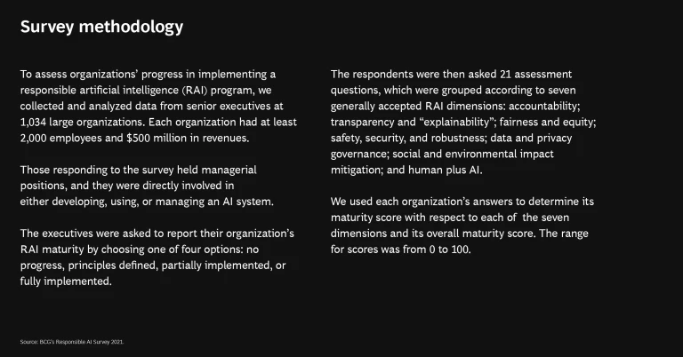 The participants were asked to define their organization’s overall progress in implementing an RAI program by choosing one of four options: no progress, principles defined, partially implemented, or fully implemented. In addition, each of the participants answered 21 assessment questions, grouped according to the seven RAI dimensions: accountability; transparency and “explainability”; fairness and equity; safety, security, and robustness; data and privacy governance; social and environmental impact mitigation; and human plus AI.