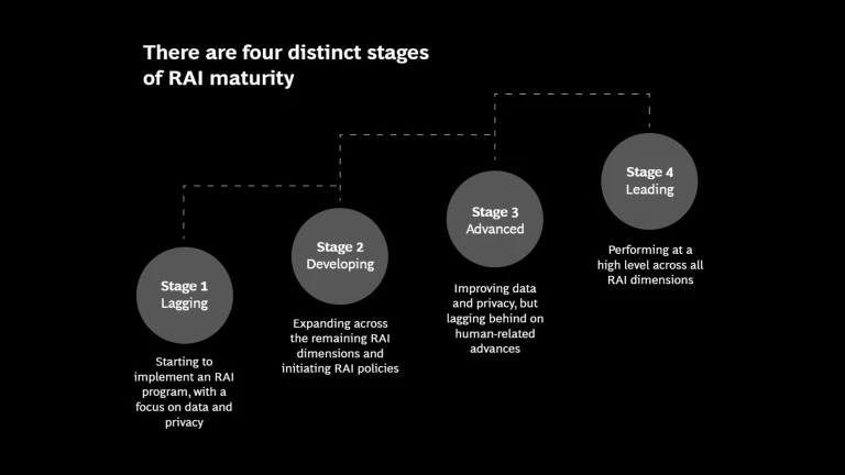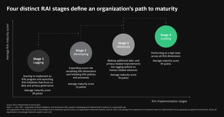 To assess organizations’ progress in implementing RAI programs—the structures, processes, and tools that help organizations ensure their AI systems work in the service of good while transforming their businesses—we collected and analyzed data from senior executives at more than 1,000 large organizations. (See the sidebar “Our Survey Methodology.”) We then categorized these organizations into four distinct stages of RAI maturity: lagging (14%), developing (34%), advanced (31%), and leading (21%). An organization’s stage reflects its progress in reaching maturity across seven generally accepted dimensions of RAI. These dimensions include fairness and equity, data and privacy governance, and human plus AI. The latter one is to ensure that AI systems are designed to empower people, preserve their authority over AI systems, and safeguard their well-being.