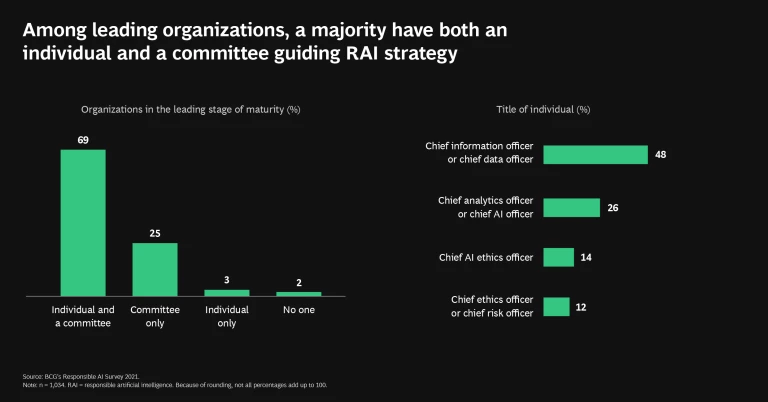 RAI leaders consistently have policies and processes that are fully deployed across their organizations covering all seven RAI dimensions. At these leading organizations, we found several key markers that are indicative of broader RAI maturity.