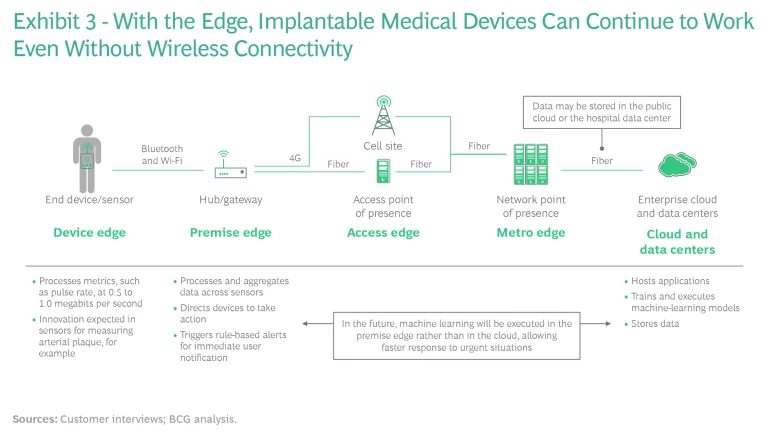 Self-driving cars are perhaps the most prominent example of edge computing in action, but there are many others, ranging from predictive maintenance to implantable medical monitoring devices. Each use accesses and benefits the edge in slightly different ways. (See Exhibit 2 and Exhibit 3.)